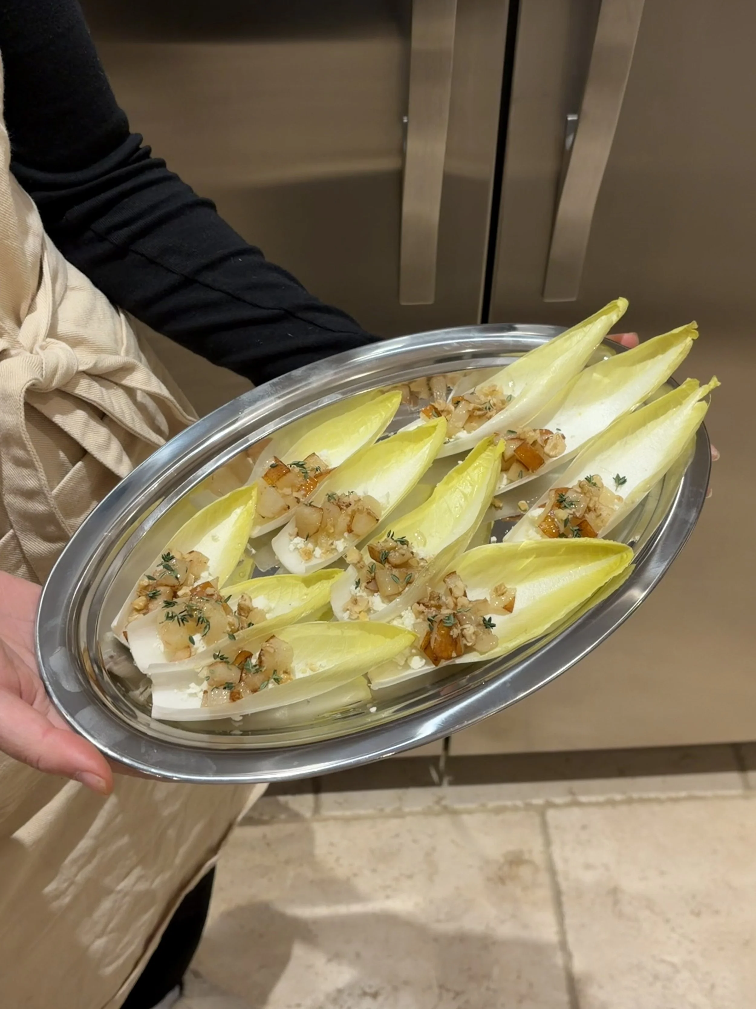 Endives with goat cheese, roasted pear, walnuts, honey & thyme